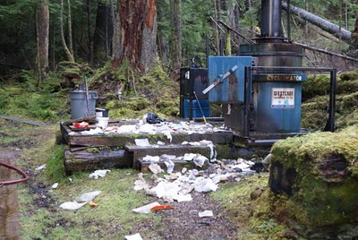 Somebody, OK me, didn't secure the door of the incinerator 100%. Following a trail of garbage I came to a clearing where he must have sat down and licked clean half a doz pudding cups and and a molasses container. I guess this answers the question that bears really do sit in the woods.