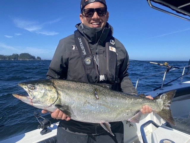 Of course, at Langara Island and the Clubhouse, the ultimate goal is to catch and release a tyee chinook salmon, and we found a few in Sept. Out at reliable Cohoe Point, fishing the same 75 feet, Richard White was pretty excited, as was I, with this catch — a 36 lb tyee we released to finish the trip to the spawning river and complete her trip.