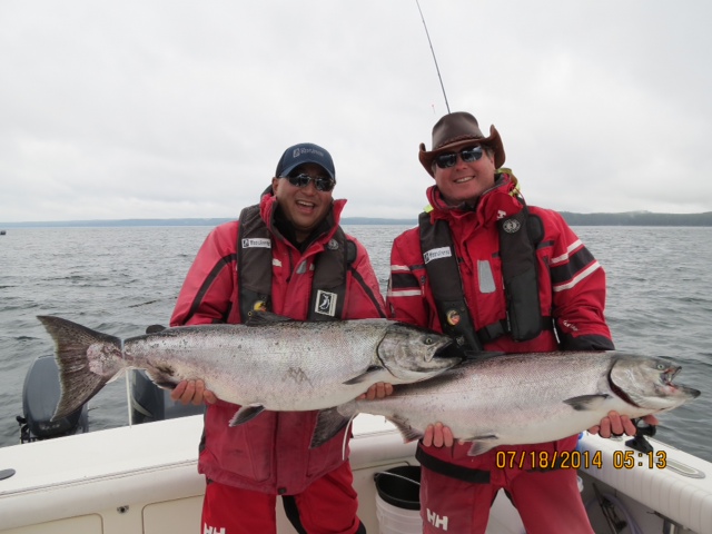 A straight gut shot easterly blowing this pm, thunder showers, and yes, some nicer Chinook fishing to report here at Langara.Sure it was wet, sunny, overcast, dark at times, crazy day here weather wise, but four tyee to report! Top fish went to catch and release angler Jack Charles, fishing with Korey, a 37 lb fish. The team rolled out at the crack of 830, stared at rod tips to 1230, when a rod buckled and the rest was history. Gunia Point coughed up another one.Shaun and one of his partners, JRod, fished Andrews and each boat grabbed a tyee at 34 lbs. Steve had an early morning appointment to learn how to cook Salmon in kelp, so back to the dock at 9am with a 31 lber and a rather large crap eating grin. Culinary week here, cooking classes for the guests. I hear rabbit is on the menu tomorrow, say what?Some great fish around since my last report, not in my boat mind you....a 64 was taken in a self-guided unit next door, as well as a 62 at the bottom of the hill so a few squeaking through. A huge 17 lb Coho was released here by a young guide, pics on his iPhone so not really usable , but what a beak on that southern Coho!A lone whale is pounding Boulder right in the kelp, feasting on needlefish. This is a hotspot for large kings right now. Not saying heaps of fish, but those patiently fishing shallow and staring at rod tips for hours are occasionally rewarded. Mid twenties are now possible as well as the very odd monster. Time is passing by quickly, still wondering where this huge run of big kings is? I hear the trollers might shut down in a week or so fishing on the Chinook, so things could pick up slightly.I had a look out west today, forget about it for now, NO FISH. Your best bet is Andrews, Cohoe, and Boulder. We have grabbed them deep at Andrews, up to 150 feet. On the other side, shallow of course, 30 to 60 feet. Tight on the beach.So yes, four tyee on the day, a nice turnaround, lets see what tomorrow brings. At the bottom I have included some photos from our last group PCL that didn't make it into my last report. Enjoy and check back soon.Mike Tonnesen, Head Guide, Screamer