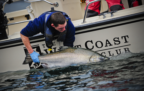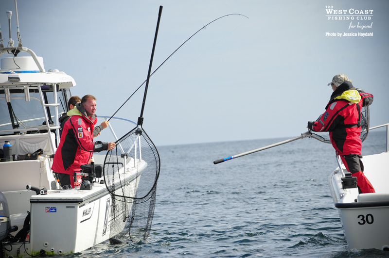 The fishing has been excellent this summer and today was no different. Guest and participant Jim Harrison hoists a nice take home Chinook. The tournament itself will be strictly catch and release. There were the usual signs of success on the water...