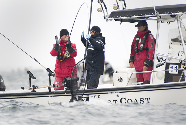 Although good in the pre-season Mike Gillis struggled to get back on top today but is a hands-on team player and passes a fish to one of the weigh boats for measurement...