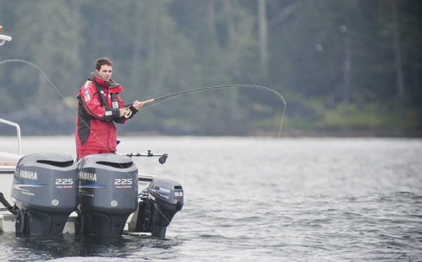 Canucks player Dan Hamhuis bends a rod as he gets initiated to salmon fishing in Haida Gwaii...