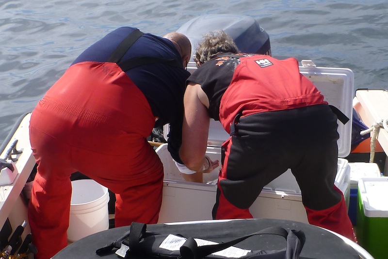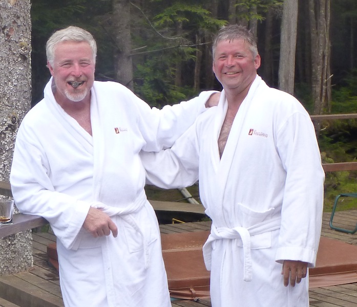 Jay and Scott help hold each other up once they'd discovered the fastest way to pass out after a long day on the water...a drink and a soak.