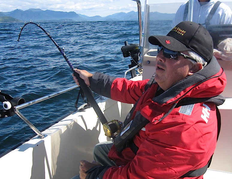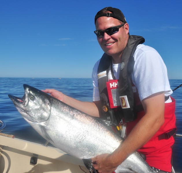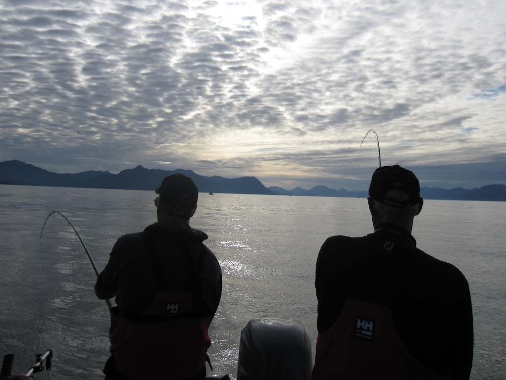 ...as soon as lines were in the water it was double header action. As the morning cloud dissipated it was sunny, flat calm and the fishing was out of control. We must have had 10+ duoble headers, a tripple header and more than 50+ chinook hooked before 11 am. I think it was the same for everyone else, bent rods, smiles and sun for all...