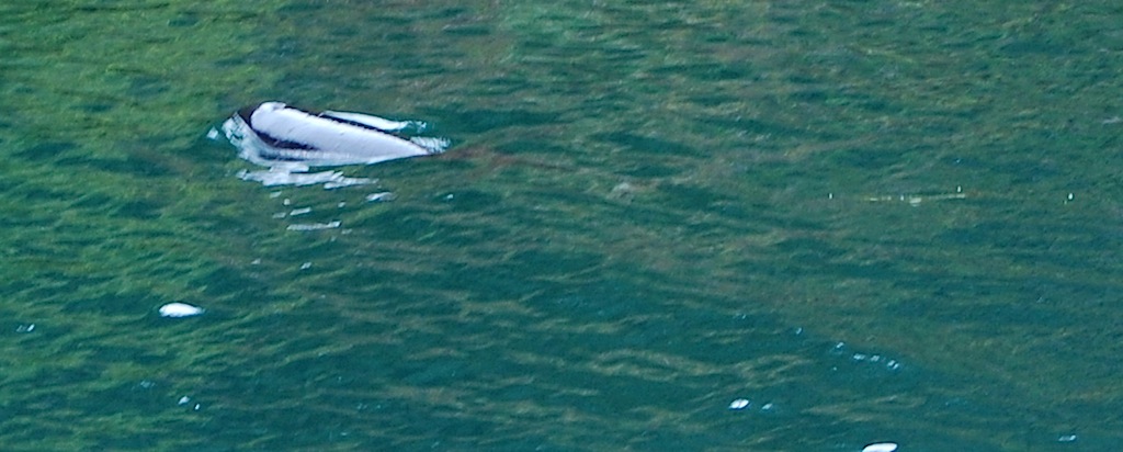 she is small and when surfacing you never see the dorsal fin which I'm presuming is well back on her body...