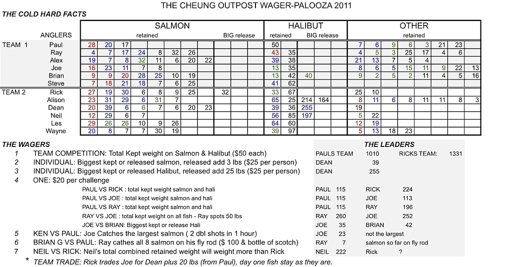 I lost my side bet with Paul and had to do a shot...all consequences of getting swept away by the "Wager-Palooza". Below are the up to date results, but there's still 2 hours of fishing on changeover morning...