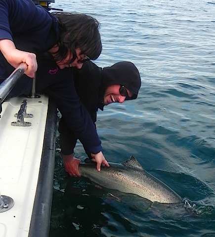 Guide Sam equally happy about the result. After a final touch goodbye they watch the big boy swim away...