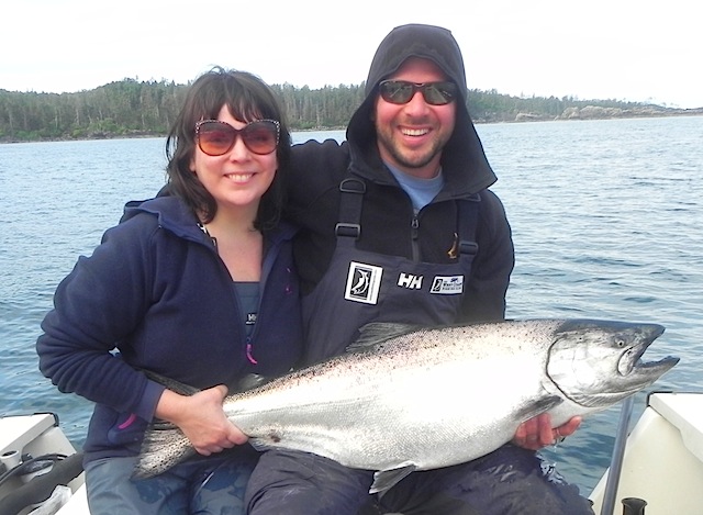 The Outpost season starts tomorrow and Justine sets the early "fish to beat" by catching and releasing this 36 pound tyee off Brock island this morning, 100 meters from the Lodge dock...