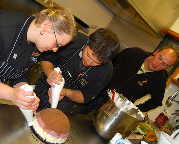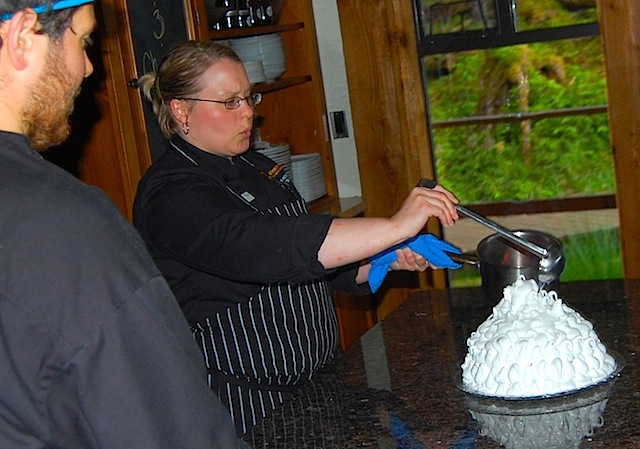 Natasha and Jordan add the meringue to a home made gelato, Neapolitan, baked "near" Alaska. Marky Mark looking on in hopes of a bowl to lick.