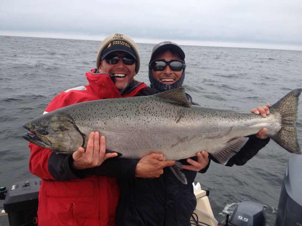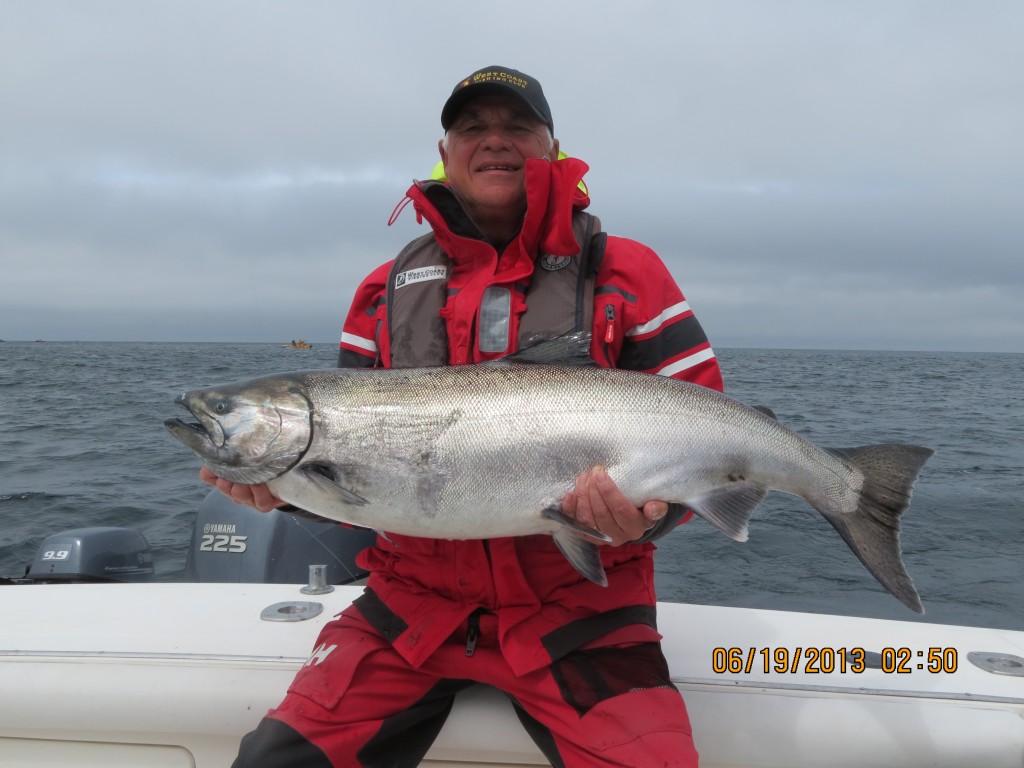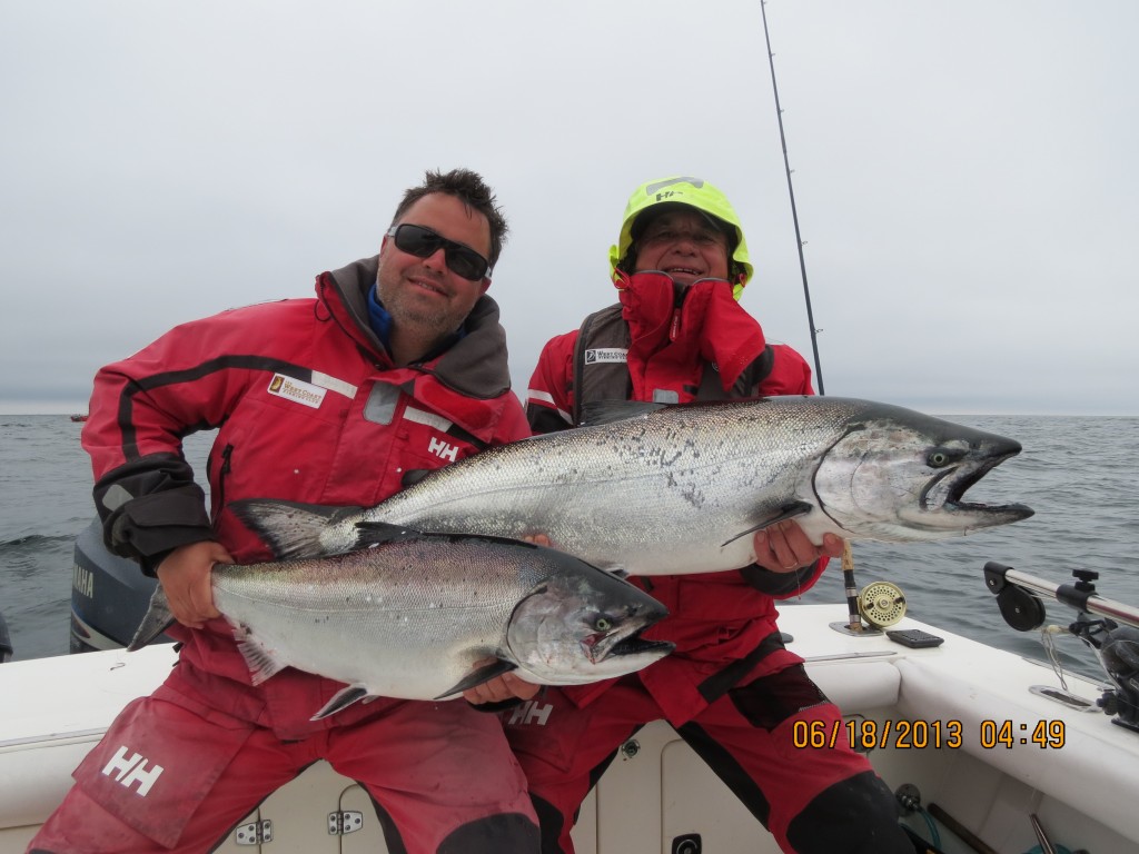 I was fishing with the Ian and John MacNaughton, and we had a good trip, with two tyees at 30 and 33 lbs respectively. The 30 was taken last night out at Lacy by Ian, 60 feet on the cable, while the 33 was this afternoon, at 230 pm out at Andrews, tight in on the kelp. What a fight, rod buckled with max drag, this fish gave it everything but unfortunately was gut hooked so no chance of an escape. We chased this slab right into the kelp, circled the bay, and on out in the tide, off the basshole! I was thinking maybe a 50? No, not this time, but a great pair of tyees for Ian!