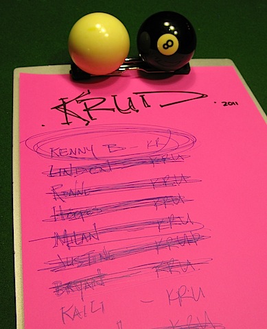 The first KRUD game of 2011 took place last night and the results are on the clipboard...another close second for Kaili.