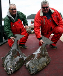 Marty Volkmar and John Dane with a 57 and 65 lbs halibut....