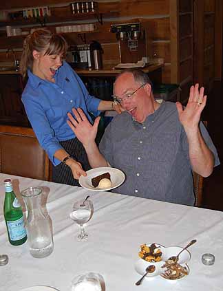 Drew was clearly thrilled! Note the home made toffee and crackle toppings in the bowl, not to mention the caramel and hot fudge sauce. With chocolate cake on the side its not a bad way to cap the day…