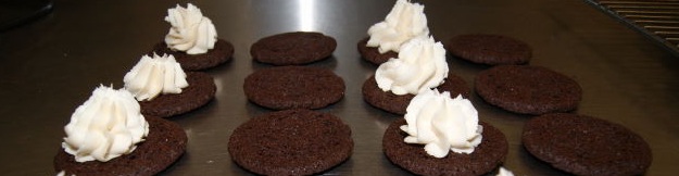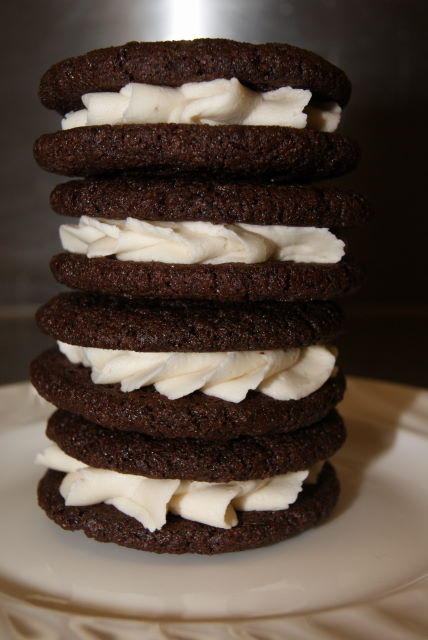 I am a cookie person. I love cookies. I love “Oreos”. I love “Double Stuff Oreos.” I think only someone who really loves cookies can get excited when they come across a recipe for homemade Oreos. Once again it was only because of Kingpin's arrival that I made these. If this sounds as if I'm using him as an excuse than guilty as charged. In the “Smitten Kitchen” recipe you can spread that wonderful filling with a knife or pipe. I liked the idea of piping, it not only gave the cookie a bit of a different look but was definitely 'double stuffed!'